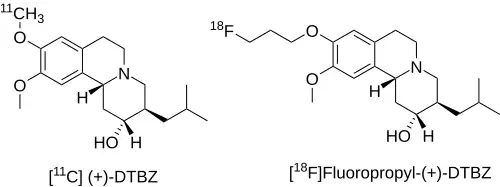 [11C]DTBZ as a PET radioligand with affinity for VMAT2 was developed in the mid 1990s by David E. Kuhl and colleagues at the University of Michigan.[3] There are two enantiomers of alpha-dihydrotetrabenazine, and the dextrorotary(or (+) isomer) has a high affinity of about 1 nanomolar Ki whereas the levorotary (or (-) isomer) has approximately 1000 fold lower affinity with a Ki of about 2 micromolar.[4]