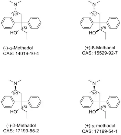 Dimepheptanol is a mixture of two isomers, alphamethadol (α-methadol) and betamethadol (β-methadol).[2] These are also available separately, and this drug has three separate entries in many national and international lists of illegal drugs, which refer to the racemic mixture dimepheptanol, and the two optical isomers.[2] Each of these isomers is itself a mixture of two isomers, and so there are in fact four isomers of dimepheptanol in total; L-α-methadol, D-α-methadol, L-β-methadol and D-β-methadol.[2]