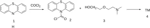 Phenothiazine (1) is reacted with phosgene to give Phenothiazine-10-carbonyl chloride [18956-87-1] (2). Further reaction with 2-(2-(dimethylamino)ethoxy)ethanol [1704-62-7] (3) completed the synthesis of Dimethoxanate (4).