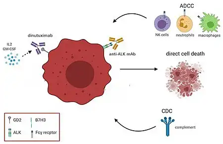 Dinutuximab and dinutuximab beta each work by binding to GD2, a glycolipid found on cells originating from the neuroectoderm during prenatal development, including neurons in the central nervous system and in the peripheral nervous system. Neuroblastoma cells have this as well. When dinutuximab binds to any cell that has GD2, that cell is destroyed via cell-mediated cytotoxicity and complement-dependent cytotoxicity.[2]