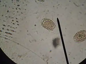 Eggs are 60–80 micrometres x 39–47 micrometres, contain an embryo, and have characteristic sculpturing of the shell.[7] They have an oval-shape and brownish-yellow hue. Eggs have a thick shell, and the surface appears to be pitted except at the poles.