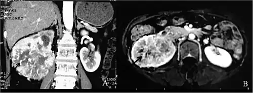 Individuals with Dioctophyme renale infection (known as dioctophymosis) typically present with unspecific symptoms including hematuria[1][3] (blood in urine), nephritis, loin pain,[7] renal enlargement, and/or renal colic[1] (intermittent pain in the kidney area), which may result from the rare migration of worms through ureters.[5][7][1][3] In some cases the fibrosis occurring after parasite infection is an incidental finding in ultrasound or CT scan, mimicking renal cancer, leading to radical nephrectomy.[11]