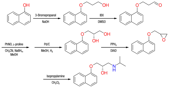 Propranolol exist in two different enantiomers, (S)-(−)- and (R)-(+)-enantiomers. The (S)-isomer is 100-fold more potent than the (R)-isomer and that is the general rule for most β-blockers. It is possible to produce the (S)-propranolol enantiomer from α-naphthol and 3-bromopropanol as seen in figure 6.[16][17] α-Naphthol and 3-bromopropanol are refluxed for 6 hours to give alcohol. The alcohol is oxidized by using 2-Iodoxybenzoic acid (IBX) to give aldehyde. The aldehyde is subjected to L-proline catalyzed asymmetric α-aminoxylation and a reduction is made with NaBH4 in methanol. A diol is obtained by Pd/C-catalyzed hydrogenolysis. Finally the diol is converted to epoxide using the Mitsunobu reaction and stirred with isopropyl amine in CH2Cl2 to give (S)-propranolol.[16]