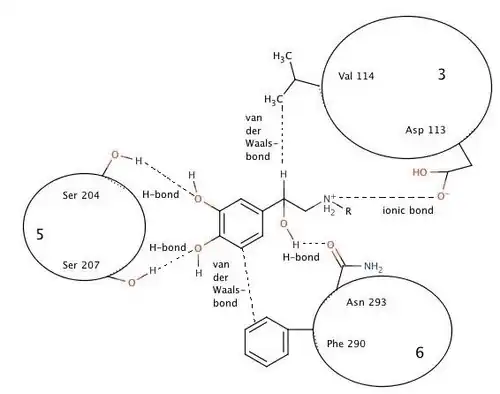 The binding of norephinephrine to the binding site consists of one ionic bond, three hydrogen bonds and van der Waals interaction in two places. Ionic bonding forms between the protonated amine and Asp-113 in helix 3. Hydrogen bonds are formed from the hydroxyl groups, linked to the catechol ring, to Ser-204 and Ser-207 in helix 5. This binding limits configurational and rotational freedom. Van der Waals forces between aromatic catechol ring and Phe-290 in helix 6 residue and Val-114 in helix 3 residue reinforce the binding. It is believed that the N-alkyl substituents fit into a hydrophobic pocket formed between residues in helix 6 and 7. The beta-carbon is chiral and must have the R-configuration so that the beta-hydroxyl group is oriented towards the Asn-293 residue in helix 6 to form a hydrogen bond essential to binding to the beta-2 receptor.[14]