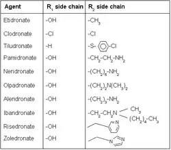 Increased carbon length of the nitrogen R2 side chain alters activity. Side chain that is made out of three carbons has proven to be the most ideal length in terms of activity, increasing or decreasing the length of the chain from there has negative effect on biological activity. Alendronate, a common bisphosphonate drug, has a three carbon length side chain for example.[17] Risedronate has heterocyclic structure containing nitrogen. Heterocyclic nitrogen containing bisphosphonates have revealed better results in terms of activity compared to earlier bisphosphonates with nitrogen bound to carbon chain. Studies on risedronate analogous with different placement of nitrogen on the ring have shown no measurable difference on biological activity. Increased length of carbon chain connected to the ring revealed negative results.[18] Zoledronate is the most potent bisphosphonate drug today only available as intravenous injection. It is the only bisphosphonate drug that has two nitrogen groups in the side chain hence its potency and route of administration differs from other drugs in the same class.[16]