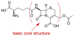 The core of the basic cephalosporin molecule consists of a two ring system which includes a β-lactam ring condensed with dihydrothiazine ring. The core itself can also be referred to as 7-aminocephalosporanic acid which can be derived by hydrolysis from the natural compound cephalosporin C. Chemical compounds containing this core are relatively stable to acid hydrolysis and tolerant to β-lactamases. Cephalosporin C contains a side-chain which is derived from D-aminoadipic acid. Modification of side chains on the relevant positions has been used to create a whole new class of cephalosporin antibiotics. Modification of side-chains in position 7 of the lactam ring seems to affect the antibacterial activity while position 3 of the dihydrothiazine ring alters pharmacokinetic properties and receptor binding affinity.[4][5]