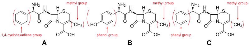 First generation cephalosporins were the first cephalosporins on the market. They have good antimicrobial activity against gram-positive bacteria but limited activity against gram-negative species.[25] The chemical structures of the first generation cephalosporins are fairly simple. As an example three drugs from this class (cefalexin, cefradine and cefadroxil) all have a single methyl group at position C-3. The common side groups at C-3 for first class cephalosporins are small uncharged groups like methyl.[5] The methyl group at position C-3 gives low affinity for common PBP which can in part explain the relatively low activity of these first drugs. Cefaclor however has a Cl group at position C-3 which gives it better binding to PBP and thus better antimicrobial activity. There is not an agreement on classifying cefaclor as a first generation cephalosporin because of the Cl group at the C-3 position and therefore its improved activity, but it is often classified as such because of its C-7 side chain which is more related to the first generation than the second. All of the first generation cephalosporins have an α-amino group at position C-7. This structure makes them vulnerable to hydrolysis by β-lactamases.[5][9]
