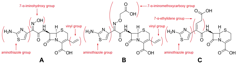 The majority of third generation cephalosporins have the aminothiazole group at position C-7. Different groups are found at the 7-α-position like 7-α-iminohydroxy and 7-α-iminomethoxy groups. Ceftibuten however possesses a 7-α-ethylidene group. This group gives ceftibuten higher resistance to enhanced spectrum β-lactamases. Many of the oral third generation cephalosporins are esters of parenteral forms and are hydrolysed by esterases in the digestive tract (cefteram pivoxil). Some of the third generation drugs can be absorbed orally without the need of esterification. This is for example done with cefixime and cefdinir by putting a vinyl group in the C-3 position.[5][9]