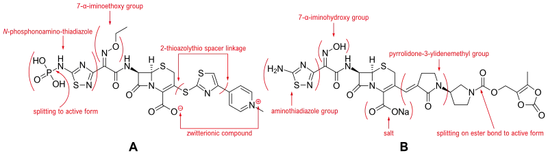 Currently there are only two drugs in this category, ceftobiprole and ceftaroline. These new drugs are also the only β-lactam antibiotics that are effective against methicillin-resistant-Staphylococcus-aureus (MRSA). Ceftobiprole is a pyrrolidinone-3-ylidenemethyl cephem. The C-3 side chain was specifically designed to have a strong binding affinity to PBP2a and PBP2x. PBP2a is known to give staphylococci resistance to other β-lactam drugs and PBPx does the same for pneumococci. Ceftobiprole also has an aminothiazoyl-hydroxyimino side chain at the C-7 position which is known to give good resistance to β-lactamase from S. aureus. Together these active groups make ceftobiprole bactericidal to MRSA. Ceftobiprole has poor water solubility and is therefore administered intravenously as an ester prodrug called ceftobiprole medocaril. It is rapidly broken down into active ceftobiprole by plasma esterases.[27] Ceftaroline was developed from the fourth generation cephalosporin cefozopran. It retains the alkoxyimino group at position C-7 from earlier generations so it is fairly stable in the presence of many β-lactamases. Since MRSA and penicillin-resistant Streptococcus pneumoniae have resistance dedicated to new types of PBP, PBP2a and PBP2x respectively, both ceftaroline and ceftobiprole have C-3 side chains specially engineered to bind these new PBP. In the case of ceftaroline this side chain contains a 2-thioazolythio spacer linkage optimised for its anti-MRSA activity. Ceftaroline has low water solubility but this problem was overcome by attaching a N-phosphonoamino group to the molecule making the intravenous prodrug ceftaroline fosamil. The prodrug is dephosphorylated in plasma to form active ceftaroline.[28]
