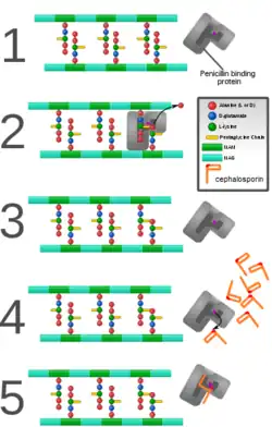 The bactericidal effects of β-lactam antibiotics are achieved through inhibition of the bacterial cell wall synthesis. The cell wall of both gram-positive and gram-negative bacteria is a tight covalently bound and cross-linked peptidoglycan network and essential for bacterial growth, cell division and cellular structure. Therefore, bacteria need enzymes that can cleave the cell wall during bacterial growth and cell division. The cell wall of bacteria is built up in two steps from the outside of the cell. In the first step, molecules of disaccharide units linked with peptides on their ends are transported from the cytoplasm of the bacteria and joined together on the outside of the wall by a transglycolase. In the second step, a transpeptidase links together long polysaccharide chains which are linked together through peptide bonds. The amino acid sequence of D-alanyl-D-alanine is recognized by the transpeptidase at the end of the peptide chain. The enzyme cleaves off the alanine on the terminal end and joins the remainder to a peptide chain from an adjacent polysaccharide.[10] This transpeptidation reaction is inhibited by β-lactam antibiotics like cephalosporins. Because of this inhibition the antibiotics are most effective when the bacteria are in the logarithmic phase of growth, where then they are synthesizing the cell wall. If the bacteria are in the stationary phase of growth, then there is no wall synthesizing in progress, and the antibiotics have much lower effect.[3]