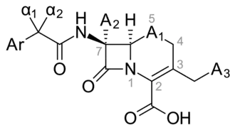 The molecular structure of cephalosporin can be altered in various ways to improve in vitro stability, anti-bacterial activity and resistance against β-lactamases. In the acidic conditions of the stomach, in vitro stability can be enhanced by the addition of an amino and a hydrogen to positions α1 and α2 of the cephalosporin structure. This results in a basic compound, an ammonium ion that is protonated in said conditions, giving us a more stable β-lactam which leads to an orally active drug. Anti-bacterial activity can be enhanced if A2 is an alkoxy group instead of a hydrogen. The 7-amino group is crucial for anti-bacterial activity. In some cases, adding a methoxy group in position A2, cephalosporin stability is enhanced toward β-lactamases. In position A1, sulfur and oxygen can be placed in the ring. Sulfur shows better anti-bacterial activity, but oxygen shows better stability towards β-lactamases. In position C6, hydrogen is crucial for biological activity. In position A3, anti-bacterial activity is greater when A3 is a 5-membered heterocycle instead of a 6-membered one. In position α1 and α2, the L-isomer is 30–40 times more stable towards β-lactamase than the D-isomer. Stability toward β-lactamase can be increased around 100-fold with the addition of methoxyoxime. Z-oxime is nearly 20,000-fold more stable than the E-oxime.[1]