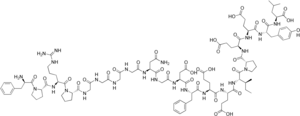Bivalirudin, a 20 amino acid polypeptide, is a synthetic analog of hirudin. Like the hirudins it is also a bivalent DTI. It has an amino-terminal D-Phe-Pro-Arg-Pro domain that is linked via four Gly residues to a dodecapeptide analog of the carboxy-terminal of hirudin. The amino-terminal domain binds to the active site and the carboxy-terminal domain binds to exosite 1 on thrombin. Different from the hirudins, once bound thrombin cleaves the Arg-Pro bond at the amino-terminal of bivalirudin and as a result restores the functions to the active site of the enzyme. Even though the carboxy-terminal domain of bivalirudin is still bound to exosite 1 on thrombin, the affinity of the bond is decreased after the amino-terminal is released. This allows substrates to substrates to compete with cleaved bivalirudin for access to exosite 1 on thrombin.[14] The use of bivalirudin has mostly been studied in the setting of acute coronary syndrome. A few studies indicate that bivalirudin is non-inferior compared to heparin and that bivalirudin is associated with a lower rate of bleeding.[4] Unlike the hirudins, bivalirudin is only partially (about 20%) excreted by the kidneys, other sites such as hepatic metabolism and proteolysis also contribute to its metabolism, making it safer to use in patients with renal impairment; however, dose adjustments are needed in severe renal impairment.[8][16]