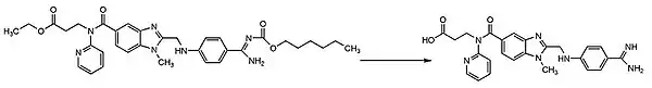 Researchers at Boehringer Ingelheim also used the publicized information about the NAPAP-fIIa crystal structure, starting with the NAPAP structure that led to the discovery of dabigatran,[9] which is a very polar compound and therefore not orally active. By masking the amidinium moiety as a carbamate-ester and turning the carboxylate into an ester they were able to make a prodrug called dabigatran etexilate,[21] a highly lipophilic, gastrointestinally absorbed and orally bioavailable double prodrug such as ximelagatran, with the plasma half-life of approximately 12 hours.[9] Dabigatran etexilate is rapidly absorbed, it lacks interaction with cytochrome P450 enzymes and with other food and drugs, there is no need for routine monitoring and it has a broad therapeutic index and a fixed-dose administration, which is excellent safety compared with warfarin.[4] Unlike ximelagatran, a long-term treatment of dabigatran etexilate has not been linked with hepatic toxicity, seeing as how the drug is predominantly eliminated (>80%) by the kidneys. Dabigatran etexilate was approved in Canada and Europe in 2008 for the prevention of VTE in patients undergoing hip- and knee surgery. In October 2010 the US FDA approved dabigatran etexilate for the prevention of stroke in patients with atrial fibrillation (AF).[6][10] Many pharmaceutical companies have attempted to develop orally bioavailable DTI drugs but dabigatran etexilate is the only one to reach the market.[9]