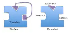 DTIs inhibit thrombin by two ways; bivalent DTIs block simultaneously the active site and exosite 1 and act as competitive inhibitors of fibrin,[13] while univalent DTIs block only the active site and can therefore both inhibit unbound and fibrin-bound thrombin. In contrast, heparin drugs bind in exosite 2 and form a bridge between thrombin and antithrombin, a natural anticoagulant substrate formed in the body, and strongly catalyzes its function. But heparin can also form a bridge between thrombin and fibrin which binds to exosite 1 which protects the thrombin from inhibiting function of heparin-antithrombin complex and increases thrombin's affinity to fibrin.[8] DTIs that bind to the anion-binding site have shown to inactivate thrombin without disconnecting thrombin from fibrin, which points to a separate binding site for fibrin.[12] DTIs aren't dependent to cofactors like antithrombin to inhibit thrombin so they can both inhibit free/soluble thrombin as well as fibrin bound thrombin unlike heparins.[10] The inhibition is either irreversible or reversible. Reversible inhibition is often linked to lesser risk of bleeding. Due to this action of DTIs they can both be used for prophylaxis as well as treatment for embolisms/clots.[8][10]