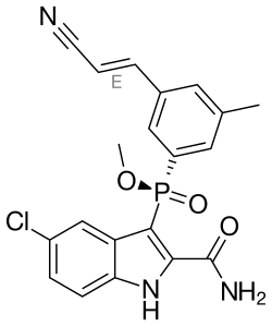 Fosdevirine (also known as IDX899 and GSK-2248761) is another next generation NNRTI developed by Idenix Pharmaceuticals and ViiV Healthcare. It belongs to the family of 3-phosphoindoles. In vitro studies have shown comparable resistance profile to that of the other next generation NNRTIs.[7] In November 2009 the candidate entered phase II clinical trials, but the trial and all further development was halted when 5 of 35 subjects receiving fosdevirine experienced delayed-onset seizures.[28]