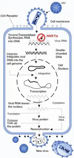 - 1 2 Sluis-Cremer N, Tachedjian G (June 2008). "Mechanisms of inhibition of HIV replication by non-nucleoside reverse transcriptase inhibitors". Virus Research. 134 (1–2): 147–56. doi:10.1016/j.virusres.2008.01.002. PMC 2745993. PMID 18372072.