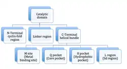 PDE enzymes are composed of 3 functional domains: an N-terminal cyclin fold domain, a linker helical domain and a C-terminal helical bundle domain (see figure 3).[9] The active site is a deep pocket at the junction of the 3 subdomains and is lined with highly conserved residues between isotypes of PDE.[14] The pocket is approximately 15 Å deep and the opening is approximately 20 by 10 Å. The volume of the active site has been calculated to be between 875 and 927 Å3.[14] The active site of PDE5 has been described as subdivided into 3 main regions based on its crystal structure in complex with sildenafil:[7]