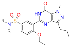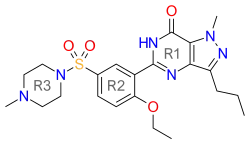 Structure-activity relationship (SAR) is demonstrated in figure 5, figure 6 and figure 7. Figure 5 demonstrates the three main groups of sildenafil, R1, R2 and R3. R1 is the pyrazolopyrimidinone ring, R2 the ethoxyphenyl ring and R3 is the methylpiperazine ring. R1 group is responsible for the binding of the drug to its active binding site of PDE5.[27]