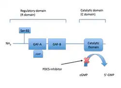 The PDE5 enzyme has a molecular mass of 200 kDa and its active state is a homodimer.[21] PDE5 consists of monomers and each contains two major functional domains: the regulatory domain (R domain) which is located in the N-terminal portion of the protein and the catalytic domain (C domain) located in the more C-terminal portion of the protein.[33][21]