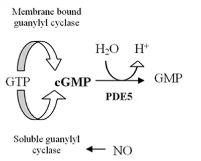 Penile erection is a hemodynamic event in the smooth muscle of corpus cavernous.[26] PDE5 is the main cGMP hydrolysing enzyme found in penile corpus cavernous.[27] Erection is triggered by release of the neurotransmitter nitric oxide (NO) from non-adrenergic and non-cholinergic neurons from nerve ending in the penis as well as from endothelial cells. NO activates soluble guanylyl cyclase in smooth muscle cells in the penis which results in increased production of 3'-5'-cyclic guanosine monophosphate from guanosine-5'-triphosphate (GTP).[21][28][29] Cyclic GMP binds to the cGMP-dependent protein kinase (PKG1) which phosphorylates several proteins that results in decreased intracellular calcium. Lower intracellular calcium leads to smooth muscle relaxation and ultimately penile erection. This pathway is demonstrated in figure 1.[29][30]