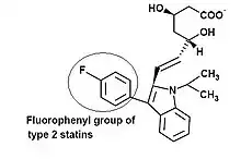 Type 2 statins Statins that are fully synthetic and have larger groups linked to the HMG-like moiety are often referred to as type 2 statins. One of the main differences between the type 1 and type 2 statins is the replacement of the butyryl group of type 1 statins by the fluorophenyl group of type 2 statins. This group is responsible for additional polar interactions that causes tighter binding to the HMGR enzyme. Statins that belong to this group are:[10]