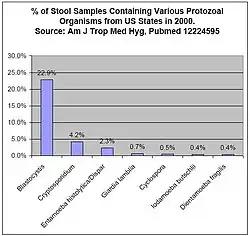 Blastocystis is a single-celled protozoan which infects the large intestine. Physicians report that patients with infection show symptoms of abdominal pain, constipation, and diarrhea.[54][55][56] One study found that 43% of IBS patients were infected with Blastocystis versus 7% of controls.[49] An additional study found that many IBS patients from whom Blastocystis could not be identified showed a strong antibody reaction to the organism, which is a type of test used to diagnose certain difficult-to-detect infections.[52] Other researchers have also reported that special testing techniques may be necessary to identify the infection in some people.[57] While some scientists believe the finding that IBS patients carry a protozoal infection to be significant, other researchers have reported their belief that the presence of the infection is not medically significant.[47] Researchers report that the infection can be resistant to common protozoal treatments in laboratory culture study,[49] and in experience with patients,;[47] therefore, identifying Blastocystis infection may not be of immediate help to a patient. A 2006 study of gastrointestinal infections in the United States suggested that Blastocystis infection has become the leading cause of protozoal diarrhea in that country.[44] Blastocystis was the most frequently identified protozoal infection found in patients in a 2006 Canadian study.[45]