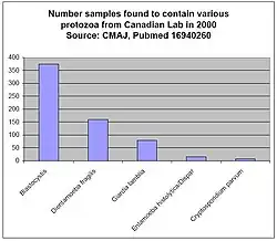 Figure 1 shows the prevalence of gastrointestinal protozoa in studies from the United States and Canada.[45][44] The most prevalent protozoa in these studies are considered emerging infectious diseases by some researchers, because a consensus does not yet exist in the medical and public health spheres concerning their importance in the role of human disease.[47][48] Researchers have suggested that their treatment may be complicated by differing opinions regarding pathogenicity, lack of reliable testing procedures, and lack of reliable treatments.[49] As with newly discovered pathogens before them, researchers are reporting that these organisms may be responsible for illnesses for which no clear cause has been found, such as irritable bowel syndrome.[50][51][52]