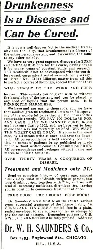| A 1904 advertisement labeling alcoholism a "disease" | |