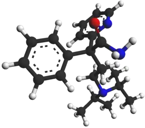 Disopyramide's Class 1a activity is similar to that of quinidine in that it targets sodium channels to inhibit conduction.[14][15] Disopyramide depresses the increase in sodium permeability of the cardiac myocyte during Phase 0 of the cardiac action potential, in turn decreasing the inward sodium current. This results in an increased threshold for excitation and a decreased upstroke velocity.[14] Disopyramide prolongs the PR interval by lengthening both the QRS and P wave duration.[15] This effect is particularly well suited in the treatment of ventricular tachycardia as it slows the action potential propagation through the atria to the ventricles. Disopyramide does not act as a blocking agent for beta or alpha adrenergic receptors, but does have a significant negative inotropic effect on the ventricular myocardium.[16] As a result, the use of disopyramide may reduce contractile force up to 42% at low doses and up to 100% in higher doses leading to heart failure.[15]