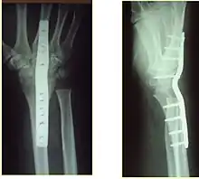 - ↑ 3.0 3.1 3.2 3.3 Alluri, RK; Hill, JR; Ghiassi, A (August 2016). "Distal Radius Fractures: Approaches, Indications, and Techniques". The Journal of Hand Surgery. 41 (8): 845–54. doi:10.1016/j.jhsa.2016.05.015. PMID 27342171.