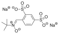 Disufenton sodium is the disulfonyl derivative of the neuroprotective nitrone spin trap phenylbutylnitrone or "PBN". PBN and its derivatives hydrolyze and oxidize in vitro to form respectively MNP-OH (AKA, NtBHA) and its parent spin-trap MNP.