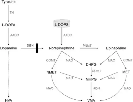 Since the conversion of dihydroxyphenylserine (Droxidopa; trade name: Northera; also known as L-DOPS, L-threo-dihydroxyphenylserine, L-threo-DOPS and SM-5688), to norepinephrine bypasses the dopamine beta-hydroxylation step of catecholamine synthesis, L-Threo-DOPS is the ideal therapeutic agent.[5][6][7][8] In humans with DβH deficiency, L-Threo-DOPS, a synthetic precursor of noradrenaline, administration has proven effective in dramatic increase of blood pressure and subsequent relief of postural symptoms.[9]