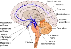 The mesolimbic pathway transmits dopamine from the ventral tegmental area (VTA), which is located in the midbrain, to the ventral striatum, which includes both the nucleus accumbens and olfactory tubercle.[5][6] The "meso" prefix in the word "mesolimbic" refers to the midbrain, or "middle brain", since "meso" means "middle" in Greek. |