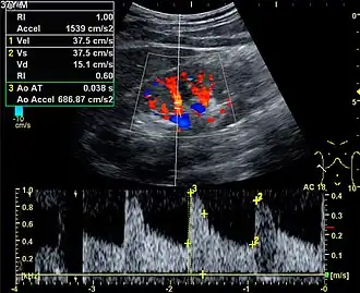 Colour Doppler shows the direction of the blood flow in red or blue (either towards or away from the transducer). Meanwhile, spectral Doppler not only shows the direction of blood flow, it also shows the phases (pulsatility) and acceleration of the blood flow. Any sudden changes in direction of blood flow produces audible sounds on the ultrasound machine.[3]
