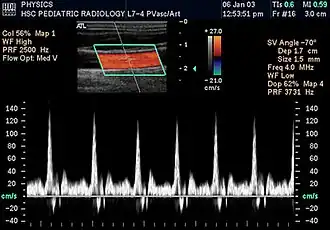 Doppler ultrasonography is medical ultrasonography that employs the Doppler effect to perform imaging of the movement of tissues and body fluids (usually blood),[1][2] and their relative velocity to the probe. By calculating the frequency shift of a particular sample volume, for example, flow in an artery or a jet of blood flow over a heart valve, its speed and direction can be determined and visualized.