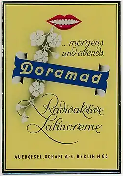 Doramad Radioactive Toothpaste (Doramad Radioaktive Zahncreme) was a brand of toothpaste produced in Germany by Auergesellschaft of Berlin from the 1920s through World War II.[1] It was known for containing thorium, a radioactive metal, and is an example of radioactive quackery.