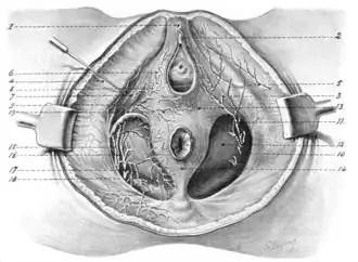 ![]() 1, Suspensory ligaments of clitoris; 2, glans clitoridis; 3, posterior superficial perineal nerve; 4, fascia lata; 5, inferior pudendal nerve; 6, sphincter vaginal muscle; 7, erector clitoridis muscle; 8, superficial perineal artery; 9, transverse perineal artery; 10, obturator fascia; 11, anterior superficial perineal nerve; 12, anal fascia; 13, deep layer of superficial fascia; 14, external sphincter ani muscle; 15, dorsal nerve of clitoris; 16, internal pudic artery; 17, perineal | |