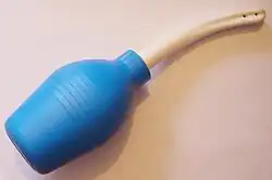 A douche is a device used to introduce a stream of water into the body for medical or hygienic reasons, or for the stream of water itself. Douche usually refers to vaginal irrigation, the rinsing of the vagina, but it can also refer to the rinsing of any body cavity. A douche bag is a piece of equipment for douching—a bag for holding the fluid used in douching. To avoid transferring intestinal bacteria to the vagina, the same bag must not be used for both an enema and a vaginal douche.
