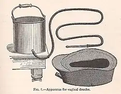 The "fountain syringe" is used for douching, by replacing the attached enema nozzle with the vaginal nozzle (shown bottom left). The vaginal nozzle is longer and thicker and has lateral holes