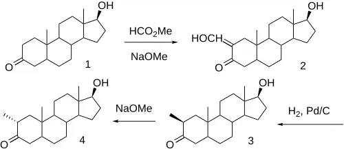 Treatment of DHT (androstan-17β-ol-3-one, stanolone) [521-18-6] (1) with methyl formate and the strong base sodium methoxide gives [4033-95-8] (2). The newly added formyl function in the product is shown in the enol form. Catalytic hydrogenation reduces that function to a methyl group (3). The addition of hydrogen from the bottom face of the molecule leads to the formation of β-methyl isomer where the methyl group occupies the higher-energy axial position. Strong base-induced equilibration of the methyl group leads to the formation of the sterically favoured equatorial α-methyl isomer, affording dromostanolone (4).