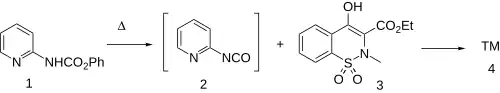 When heated, phenyl pyridin-2-ylcarbamate (1) decomposes to 2-isocyanatopyridine (2) which reacts with the heterocyclic compound (3) to give droxicam.[2][3][4]