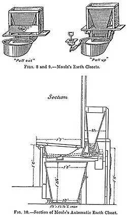 In partnership with James Bannehr, he patented his device (No. 1316, dated 28 May 1860). Among his works bearing on the subject were The Advantages of the Dry Earth System (1868), The Impossibility overcome: or the Inoffensive, Safe, and Economical Disposal of the Refuse of Towns and Villages (1870), The Dry Earth System (1871), Town Refuse, the Remedy for Local Taxation (1872), and National Health and Wealth promoted by the general adoption of the Dry Earth System (1873). His system was adopted in private houses, in rural districts, in military camps, in many hospitals, and extensively in the British Raj.[8] Ultimately, however, it failed to gain public support as attention turned to the water-flushed toilet connected to a sewer system.