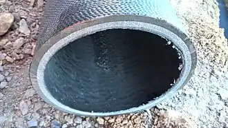 The ductile iron used to manufacture the pipe is characterized by the spheroidal or nodular nature of the graphite within the iron.[2] Typically, the pipe is manufactured using centrifugal casting in metal or resin lined moulds.[3] Protective internal linings and external coatings are often applied to ductile iron pipes to inhibit corrosion: the standard internal lining is cement mortar and standard external coatings include bonded zinc, asphalt or water-based paint. In highly corrosive environments loose polyethylene sleeving (LPS) to encase the pipe may also be used.