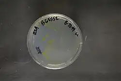 Duganella is named after the American microbiologist, P.R. Dugan, who first isolated the organism from sewage and polluted water.[3] Duganella is in class Betaproteobacteria and order Burkholderiales. The molecular percent of Duganella's G/C content is 63–64.[3] Morphological characteristics consist of: straight or slightly curved rods, and in liquid growth media, either colonies that are "occasionally fingerlike," appear, or dispersed growth with little or no formation of colonies appear. When grown on nutrient agar, the colonies are pale yellow to "straw-colored."[3] Duganella is able to produce violacein, a vibrant purple compound derived from the condensation of two molecules of tryptophan that is known to be anti-tumor, anti-fungal, and anti-viral.[4][5] Violacein producing bacterial strains have been isolated from many different environments, Duganella producing violacein strains have been isolated from agricultural and forest soils.[6] Duganella is Gram negative, with cellular appendages of a single polar flagellum, making it motile. Duganella needs need oxygen to survive. Duganellais mesophilic, neutrophilic, and chemoorganotrophic. Duganella zoogleoides display growth on nutrient or mineral media supplemented with simple organic compounds. Morphological characteristics include: glistening colonies, convex-shaped with entire margins, and are also pale yellow. The colonies appear to be dry and wrinkly, "leather-like."[3]