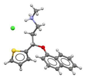 - ↑ Bymaster FP, Beedle EE, Findlay J, Gallagher PT, Krushinski JH, Mitchell S, Robertson DW, Thompson DC, Wallace L, Wong DT (December 2003). "Duloxetine (Cymbalta), a dual inhibitor of serotonin and norepinephrine reuptake". Bioorganic & Medicinal Chemistry Letters. 13 (24): 4477–80. doi:10.1016/j.bmcl.2003.08.079. PMID 14643350.