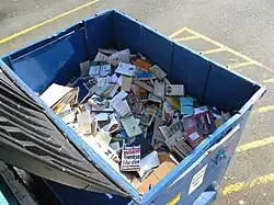 Unsold books from a bookstore near the University of Washington are piled into a dumpster. - Books and periodicals. As proof to publishing houses of unsold merchandise, booksellers will routinely remove the front covers of printed materials to render them destroyed prior to disposing of their remains in the garbage. Though readable, many damaged publications have disclaimers and legal notices against their existence or sale.