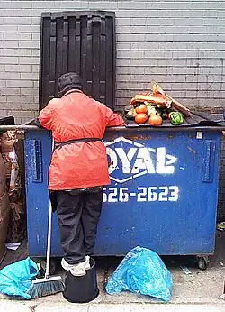 - Food. In many developing countries, food is rarely thrown away unless it is rotten as food is scarce in comparison to developed nations. In countries like the United States, where 40 to 50 percent of food is wasted, the trash contains a lot more food to gather.[47] In many countries, charities collect excess food from supermarkets and restaurants and distribute it to impoverished neighbourhoods. Trash pickers, Karung guni, Zabaleen, and rag and bone men in these countries may concentrate on looking for usable items or scrap materials to sell rather than food items. In the United States, Canada, and Europe, some bakeries, grocery stores, or restaurants will routinely donate food according to a Good Samaritan Food Donation Act, but more often, because of health laws or company policy, they are required to discard food items by the expiration date, because of overstock, being overly ripened, spoiled, cosmetically imperfect, or blemished.