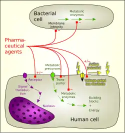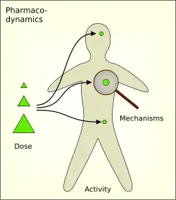 Pharmacodynamics: Study of pharmacological actions on living systems, including the reactions with and binding to cell constituents, and the biochemical and physiological consequences of these actions.[2]
