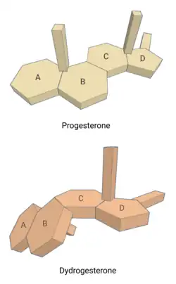 - ↑ Colombo D, Ferraboschi P, Prestileo P, Toma L (January 2006). "A comparative molecular modeling study of dydrogesterone with other progestational agents through theoretical calculations and nuclear magnetic resonance spectroscopy". The Journal of Steroid Biochemistry and Molecular Biology. 98 (1): 56–62. doi:10.1016/j.jsbmb.2005.07.009. PMID 16216490. S2CID 35936384.