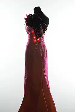 In 1968, the Museum of Contemporary Craft in New York City held a ground-breaking exhibition called Body Covering that focused on the relationship between technology and apparel. The show featured astronauts' space suits along with clothing that could inflate and deflate, light up, and heat and cool itself.[9] Particularly noteworthy in this collection was the work of Diana Dew,[10] a designer who created a line of electronic fashion, including electroluminescent party dresses and belts that could sound alarm sirens.[11]